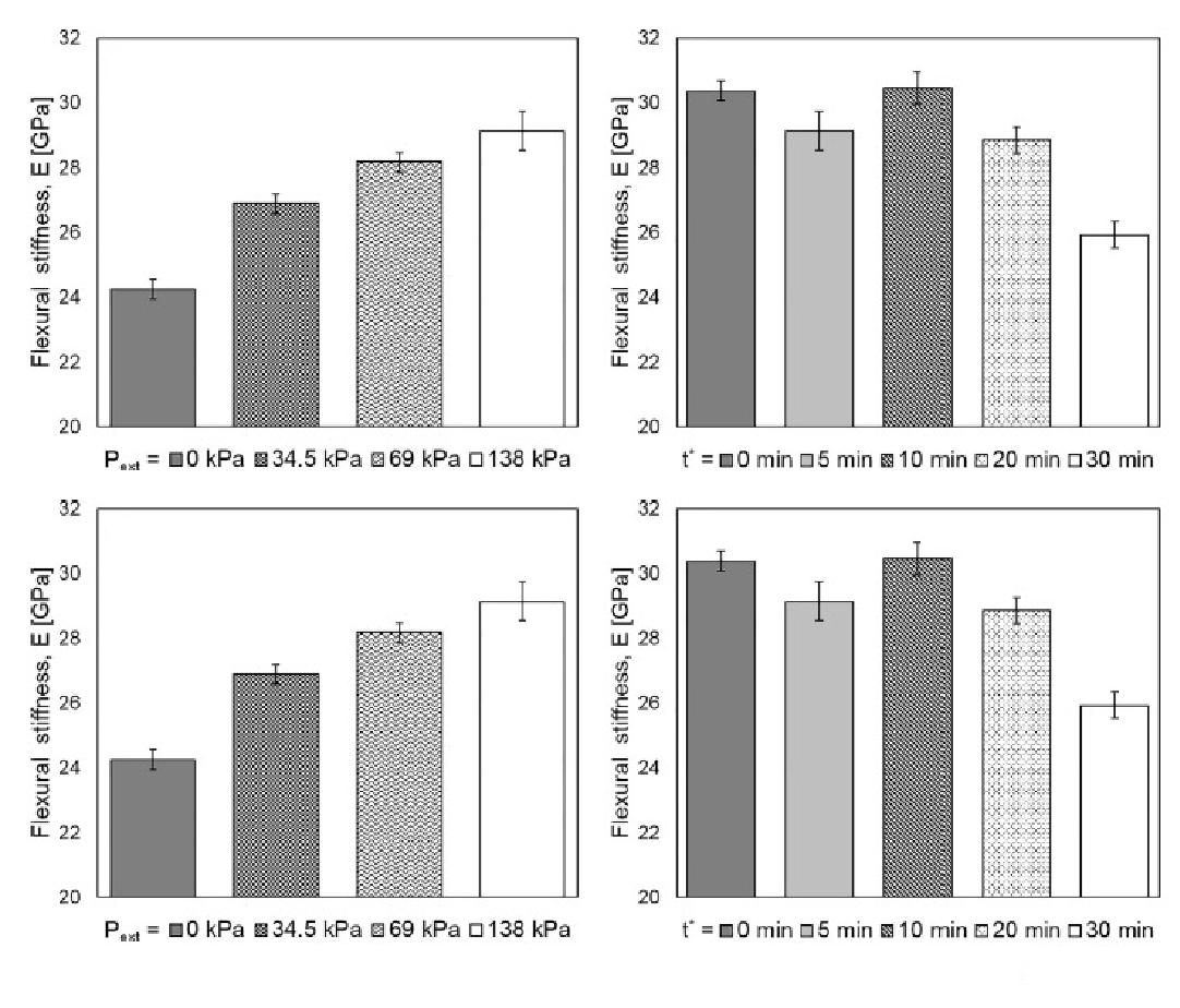 Figure 4: Effect of applying various pressures and times on flexural strength and stiffness [54].